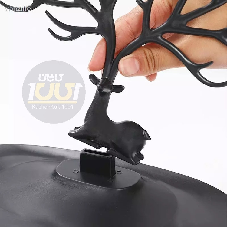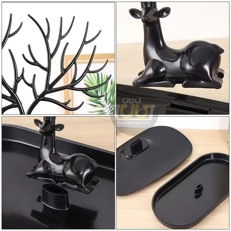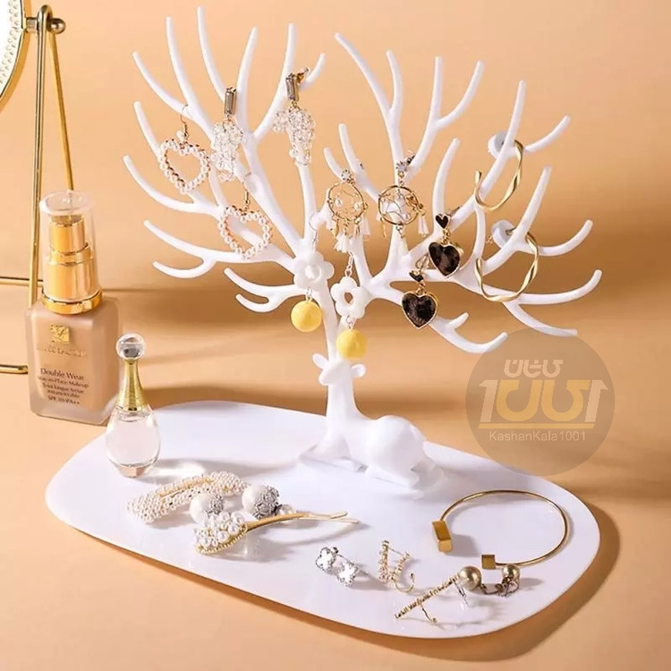 و علاوه بر شاخ های گوزن که به منظور آویزان کردن زیورآلات در نظر گرفته شده است، دارای یک سینی به منظورقرار دادن لوازم آرایشی، کیف پول، ساعت و... است که می تواند تاثیر بسزایی در مرتب بودن روی میز آرایش شما داشته باشد. جنس این استند از مواد پلاستیکی درجه یک ABS می باشد و علاوه بر یک استند می تواند به عنوان یک وسیله دکوراتیو نیز مورد استفاده قرار گیرد.