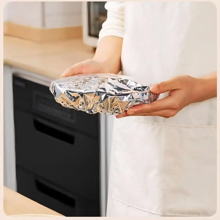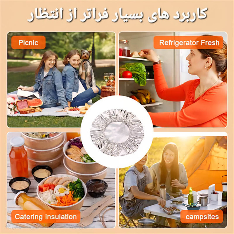 درپوش آلومینیومی محافظ غذا به شکل دایره بوده و قطری حدود 36 سانتی متر دارد که میتوان آن را بر روی ظروف مختلف کشیده و از غذاهایی که در درون ظروف هستند در برابر سرد شدن ، گرد و غبار ، حشرات و … محافظت کرده و حس یک غذای تازه پخت شده را حتی بعد از گذشت چند ساعت به شما منتقل کند. دور تا دور ورودی در پوش یک کش سرتاسری کار شده است که درپوش را به ظرف پلمپ کرده و از ورود و خروج هر چیزی حتی گرمای مواد غذایی جلوگیری میکند ، از جمله ویژگی های این درپوش چند کاره قابلیت استفاده در ماکروفر میباشد که تا 110 درجه سانتی گراد نیز آستانه تحمل دم دارد